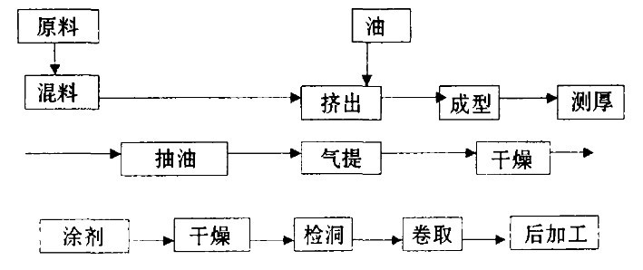 PE隔板的工藝流程由于其引進(jìn)技術(shù)的不同,在流程設(shè)計(jì)上稍有不同,但總的設(shè)計(jì)原則大同小異,基本生產(chǎn)過程見下圖: