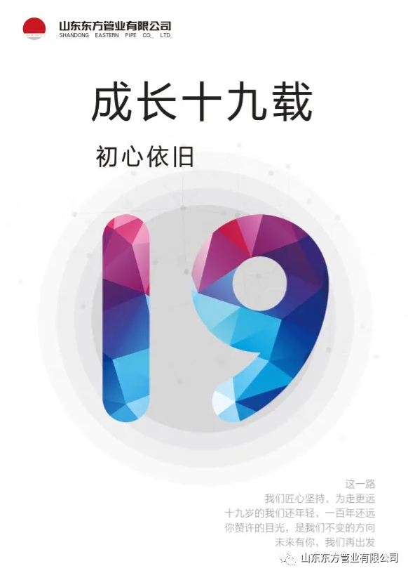 9月21日,山東東方管業(yè)有限公司迎來第19個(gè)生日,19年來,山東東方管業(yè)有限公司堅(jiān)持“ 與員工共謀發(fā)展,與客戶共創(chuàng)輝煌 ”的企業(yè)價(jià)值觀,秉承“ 質(zhì)量是企業(yè)的生命 ”的經(jīng)營理念,堅(jiān)持專業(yè)化經(jīng)營,加大合規(guī)管控力度,打造誠信服務(wù)體系,扎根齊魯大地精耕細(xì)作。